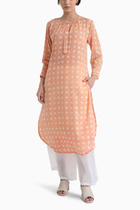 Featuring Pink Sunkissed Kurta with Pants by Jayati Goenka from Sunkissed Collection. Block printed Cotton long classic kurta paired with soft finishhed cotton silk like white trousers with pockets.The tunic and the trousers is minutely detailed with handwork in golden thread and by signature handmade buttons.