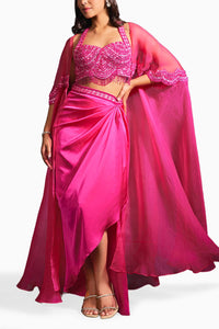 Featuring Pink Tahira Embellished Coord Set in Organza, Net, Lycra Satin. Hand Embellished in Fuchsia Pink hues. Blouse is embroidered, Paired with waist band drape skirt, Styled with cape.