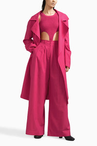 Featuring a set of well-tailored long-pleated trouser, a smocked bodysuit and classic long trench jacket.