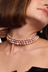 Triple Baroque Pearl Necklace - Pink is a timeless layering piece crafted with 9/10 mm freshwater baroque pearls in an elegant triple-strand silhouette. The organic pearl shapes and fluid drape create a refined statement, perfect for adding effortless sophistication to both daytime and evening looks.