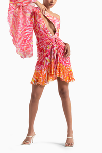 The Pink Twisted Leaf short dress is a trendy and chic piece that seamlessly blends nature-inspired elements with modern design. The soft pink color conveys a sense of charm and elegance, while the twisted leaf pattern adds an organic and playful touch. The front cut-out detail, adorned with a stylish ring, introduces a bold and contemporary twist, allowing for a hint of skin exposure. This dress is a perfect choice for those who want to make a fashionable statement, marrying the beauty of nature with edgy sophistication, creating a look that's both alluring and unique.