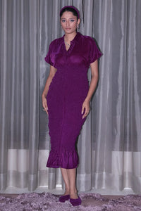 Embrace elegance with this Pink Velvet Smocking Dress, featuring intricate celosia smocking and a retextured velvet finish. Designed in a relaxed bodycon fit with a cropped body, it boasts a ruffled hem and a stylish false ruched placket. Fabric buttons and concealed stretch add comfort and charm.