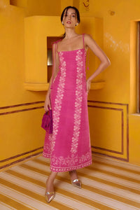 Featuring the Pink Venus Dress by DeCastro Moda, this elegant pink chikan corset dress highlights delicate embroidery and adjustable side ties, blending traditional craftsmanship with contemporary design for a graceful and feminine look.