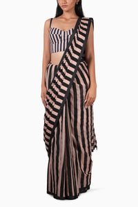 A hand-block printed striped corset paired with a soft mul saree featuring subtle prints and piping on the borders. A comfortable and stylish set that blends traditional charm with a modern look.