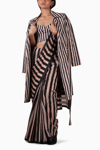 A hand-block printed striped corset paired with a soft mul saree featuring block prints and piping on the borders. Layered with a classic trench jacket in matching block-printed stripes, complete with side pockets and a fabric belt. A comfortable and stylish 3-piece set that blends traditional charm with a modern edge.