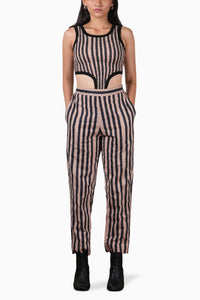 Comfortable narrow-fit pants in handwoven fabric, featuring block-printed stripes, elastic at the back, and side pockets.