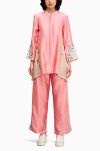 The Pink Zinnia Appliqued Shirt features intricate floral applique detailing and a stylized neckline, adding a touch of sophistication and modern elegance. Paired with straight pants in Chanderi, this ensemble combines contemporary style with traditional craftsmanship, making it an ideal choice for both formal and semi-formal occasions.