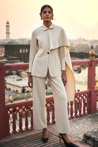 Pinstripe blazer with a scarf shawl inspired drape over the wearer's left shoulder. Single show button in the front. Full sleeves, relaxed fit. Made of all weather suiting material.