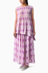 The Pintuck Plum Co-ord Set features an asymmetrical pintuck top paired with an elasticated skirt. Crafted in rich purple Dabu hand-block printed Chanderi silk, printed in Bagru near Jaipur, it blends contemporary design with traditional artistry.