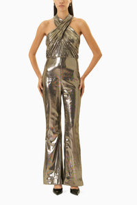 Pipa Jumpsuit is a halterneck jumpsuit with drape bodice style. It is Back less with button fastening at nape. Fit and flare at the bottom and Conceal zipper closure at the back.
