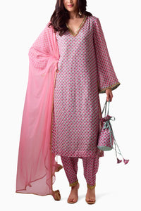 pista georgette teen patti printed kurta with intricate coin embroidery at the neckline paired with crepe teen patti printed salwar adorned with pink net dupatta , gota borders and handmade latkans with stylish potli bag.