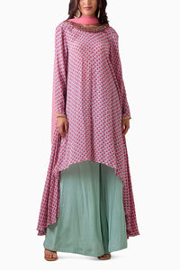 Pista georgette teen patti printed side godet asymmetrical kurta with intricate rain hand embroidery on the neckline paired with wide leg crepe palazzo pants .