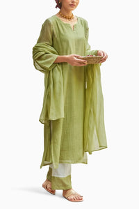 Featuring a stunning Handwoven Chanderi Comfort-Fit Kurta Set in a beautiful combination of pista green and ivory, this ensemble is embellished with intricate zardozi and sequins hand embroidery, adding a touch of luxurious detail. The kurta is paired with an ivory cotton trouser, featuring color-block and Mukesh detailing for a unique and modern twist. Completing the look is a Handwoven chanderi half-width stole, enhancing the outfit with elegance and sophistication, perfect for any festive or special occasion.