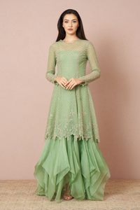 Featuring a pista green organza jaal embroidered kurta in organza base. It is paired with matching 6 kali inner slip dress. The set is crafted with the finest materials and will accentuate the look.