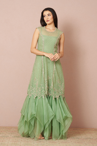 Featuring a pista green organza jaal embroidered kurta in organza base. It is paired with matching 6 kali inner slip dress. The set is crafted with the finest materials and will accentuate the look.