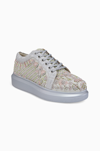 Our Pista Rose classic sneakers are crafted in a combination of microsuede and silver fabric. They are decorated with floral motifs, each embroidered using ornate crafts like zardozi, jaali and sequin work. They’re perfect for both day brunches and starry soirees. The pair’s happy colours are a treat for the eyes. Shades of green and pink come together melodiously, making the shoe look magical. The artisans of Anaar take 60 hours to carefully construct this pair.
