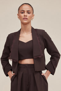 Crop single-breasted blazer with single button closure. Lapel with Chantilly lace details. Semi elasticated sleeves to give rusching effect. Fully-lined.