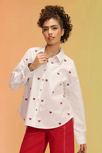 Featuring Pixie White Shirt by Chilosophy's Queendom Collection, this free-size poplin shirt is adorned with metallic buttons and charming pixie hearts embroidered throughout. With denim laser-cut hearts and an inspiring "I believe in magic!" quote, it’s a magical addition to any wardrobe.