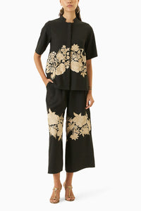 Black half-sleeve pant set with placed gara stitch-inspired motif embroidery at the front and back. Top has a band collar and concealed button placket. Pant is elasticated at the waist.