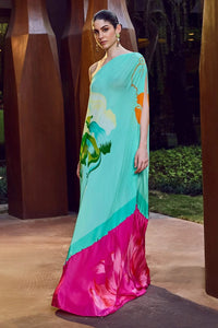 Make a statement in this one-shoulder kaftan. Featuring vibrant geometric placement prints, and an elasticated waist with a tasseled belt, it combines elegance and modern flair for an unforgettable resort style.