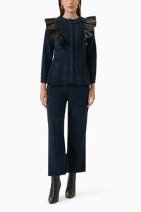 Effortless style, great attention to detail, fit, and fabric is unsurpassed. The faux leather ruffled jacket and bottom makes this co-ord set an all time classic.