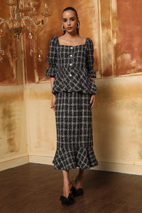 Classic exquisite metallic tweed co-ord set with a button-down peplum blouse and a stylish skirt. Pair it with boots for the perfect winter.