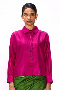 A silk shirt blouse in magenta. It is lined and comes with a contrast itajime magenta and navy detail in the collar. The placket features vibrant multi coloured buttons, while the back reveals a surprise pop of navy in the box pleat.
