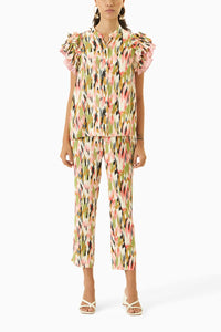 This slay play co-ord in ikat print fabric is gonna be your go to go this season with exaggerated ruffles on the shoulder giving that perfect ounce, ban collar with front button opening. Paired with same slim fit pants.