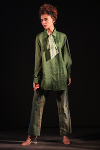 Introducing a stylish and distinctive ensemble: the pleated bow knot silk shirt paired with tie dye bell-bottom silk pants. This combination merges luxurious silk fabric with artistic tie dye patterns, creating a sophisticated yet vibrant statement. The pleated bow knot silk shirt features intricate pleating that adds texture and refinement to the garment. Complementing the shirt are the tie dye bell-bottom silk pants, which bring a modern and playful element to the ensemble.ÂÂ