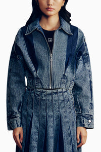 This unique cropped jacket is featured in a staple, relaxed fit with defined pleat fading wash effect. It is tailored from cotton denim light wash for added dimension.