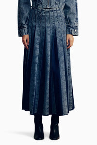 This ankle-grazing skirt is made from denim that is panel fading washed and is pleated along the waistline to create movement.