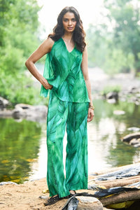 Featuring a tonal vibrant leaf print, this sleeveless top is crafted from pleated fabric in an easy A-line silhouette with a front V-neckline and raw hem detailing. Paired with matching straight-fit pants in coordinating pleated fabric, designed with a fully elasticated waist and raw hem for a relaxed yet polished look.