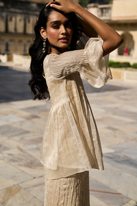 A-line top crafted in a soft, gold and ivory striped textured tissue fabric with fine hand applied pleating details at the top. Features a round neckline, three-quarter sleeves that flare out toward the hem, and a relaxed, flowing silhouette. Comes with a cami. Designed for comfort and elegance, perfect for versatile styling.