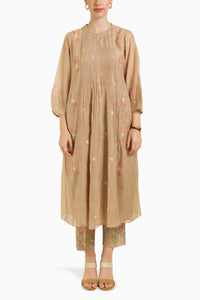 This elegant ensemble features a beige Mul Chanderi pleated tunic, offering a graceful and sophisticated silhouette. Paired with straight printed pants in Silk Chanderi, the outfit exudes a perfect blend of comfort and luxury. The delicate pleats and intricate prints add texture and visual interest, making it ideal for formal or semi-formal occasions, while maintaining an effortlessly chic appeal.
