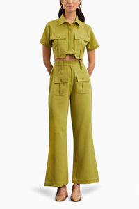 Olive co-ord set featuring a top and trousers, both with pocket details.