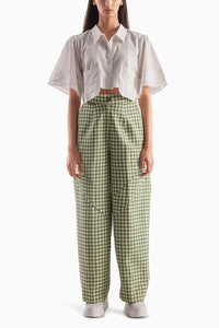 Discover contemporary elegance with the Pocket Perfection Co-ord Set. The white crop shirt, enhanced by statement pockets outlined in meticulous handwork, features uniquely embroidered sleeves and subtle tonal detailing at the corners. Paired with green checkered pants, accented by sleek checkered stripes along the front thighs, this set blends effortless style with artistic craftsmanship. A perfect fusion of modern design and timeless charm.