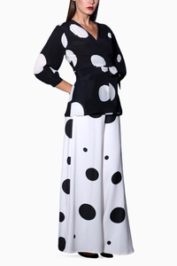 Featuring Polka Dot Wrap Top with Flared Pants by Swatee Singh. Embrace timeless charm in black and ivory polka dot heavy crepe and crepe. This relaxed 2-piece set combines style and comfort effortlessly.
