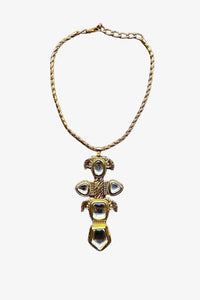 The Polki Acanthus Necklace features intricate acanthus leaf motifs adorned with dazzling Polki stones. Crafted from copper and brass with a 22k gold and white rhodium finish, this gold-toned piece combines classic elegance with detailed artistry, perfect for enhancing both traditional and contemporary looks.