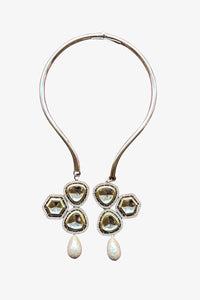 The Polki Celestial Collar Necklace dazzles with cosmic-inspired design and shimmering Polki stones. Crafted from copper and brass, finished with 22k gold and white rhodium, this gold-toned collar adds a radiant and sophisticated touch to any festive or formal outfit.