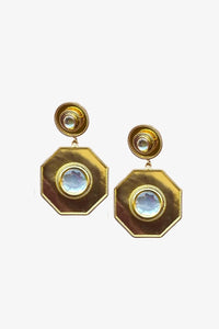 The Polki Hexagon Earrings showcase a striking geometric hexagon design embellished with radiant Polki stones. Crafted from copper and brass with a rich 22k gold and white rhodium finish, these gold-toned earrings add a bold and elegant touch to both traditional and contemporary styles.