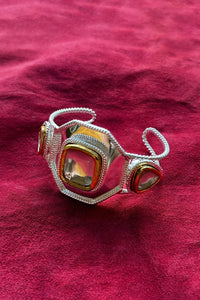 The Polki Hexagon Handcuff showcases a sleek geometric hexagon design adorned with shimmering Polki stones. Crafted from copper and brass with a silver finish enhanced by 22k gold and white rhodium, this elegant cuff blends modern style with refined sophistication for any occasion.