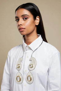 The Polki Paisley Reverse Necklace offers a unique take on traditional design. Crafted from copper and brass with a 22k gold or white rhodium finish, it features intricate paisley patterns accented with Polki stones. A distinctive piece that adds elegance and artistic flair to any outfit.