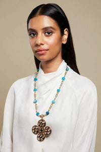 The Polki Pope Necklace shines with a rich gold finish, crafted from copper and brass with a 22k gold or white rhodium coating. Featuring radiant Polki stones, this elegant piece combines timeless tradition with contemporary style for a refined and versatile statement.