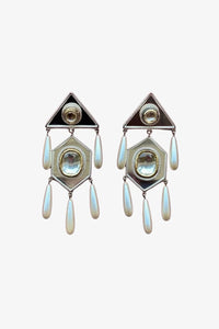 The Polki Triangular Hexagon Drop Earrings feature a unique geometric blend of triangular and hexagonal shapes adorned with sparkling Polki stones. Crafted from copper and brass with a silver finish enhanced by 22k gold and white rhodium, these earrings add modern elegance to any outfit.