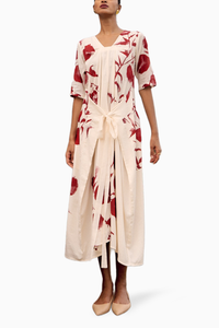 Featuring an off white mul dress with front tie ups, half sleeves and front patch pockets. One of a kind, this print is a part of water colour series in florals.