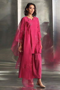 Brighten up your wardrobe with this vibrant pop pink chanderi sharara set, featuring intricate nakshi work. The flowy kurta exudes elegance, perfectly paired with a plain sharara for a balanced look. A lightweight organza dupatta adorned with delicate nakshi handwork adds a sophisticated finishing touch. The elasticated lower with a drawstring ensures comfort without compromising style, making it ideal for any festive occasion!