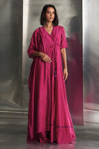 Step out in style with this vibrant pop pink angrakha wrap-around anarkali, featuring embellished sleeves adorned with gems and studs, along with delicate pleated detailing at the neckline and handcrafted tassels. Paired with chic jogger pants and an exquisite embroidered dupatta with beautiful crochet lace, this fusion set adds a unique charm to your persona. The elasticated bottoms with a drawstring ensure comfort without compromising on elegance!