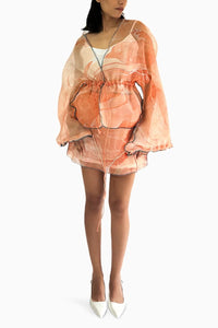 The Poppies Co-Ord Set is crafted from luxurious orange organza, bringing a light, airy feel to this bold ensemble. The top features flared sleeves with tie strings at the cuffs, adding an elegant, flowing detail. Both the top and skirt showcase visible inside-out seaming and royal blue overstitching, celebrating the quality of craftsmanship with every seam. The tie strings at the waist and skirt closure enhance both the fit and visual interest, adding a versatile, customizable element to the design.