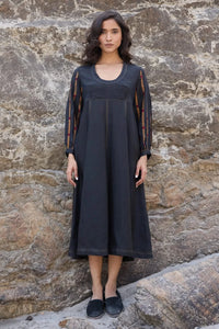 The Poppy Brown Dress is a beautifully paneled design featuring hand-embroidered block pleated sleeves. This elegant dress combines structured styling with intricate detailing, offering a perfect balance of modern sophistication and timeless charm.