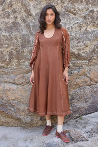 The Poppy Brown Dress is a beautifully paneled design featuring hand-embroidered block pleated sleeves. This elegant dress combines structured styling with intricate detailing, offering a perfect balance of modern sophistication and timeless charm.